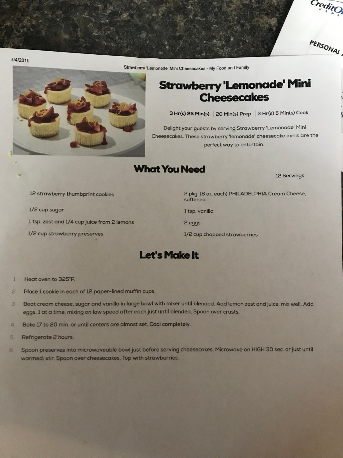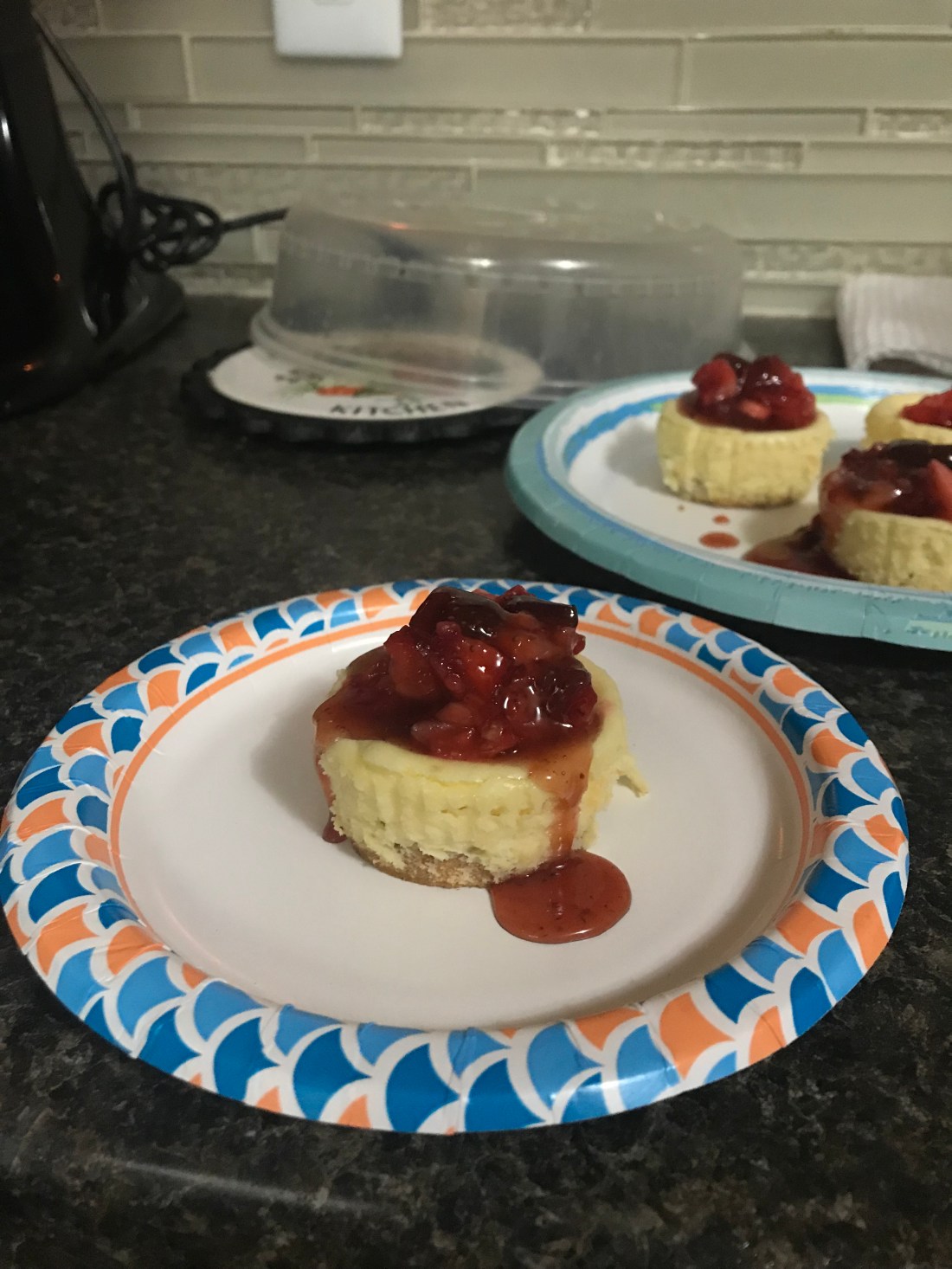 I made these little cheesecakes on April 4th. My family has definitely been enjoying the little deserts I’ve made for them. When I told them I was making cheesecake they couldn’t wait to try it! Each of my family members who got to try the cheesecake said they were great. I personally think the cheesecakes would have been great without the jelly on top. The sweetness from the jelly took away from the cheesecake. All you could mainly taste was the strawberry jam. If I decide to make another cheesecake i won’t be adding strawberry jam.
