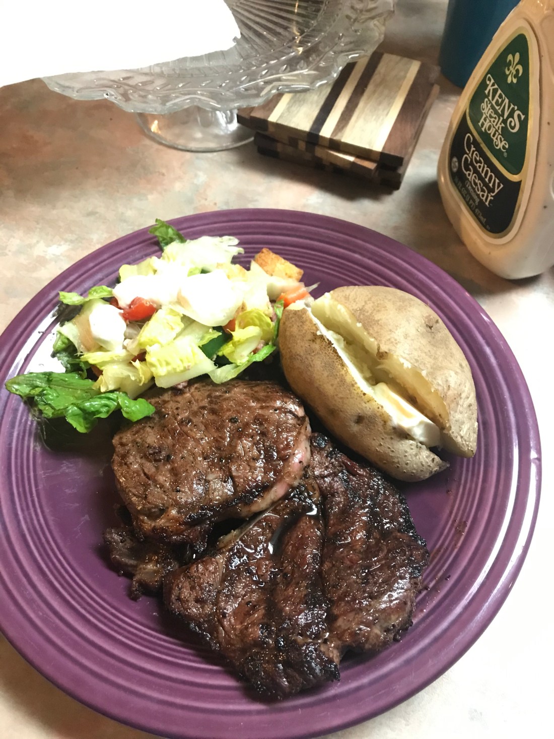 On April 7th i learned how to make steak on the grill. I did have help. Only cause i know nothing about steak or how to use a grill. π First we seasoned the steak. After the seasoning was done i cut up lettuce and vegetables to make a salad. I used lettuce, carrots, tomatoes, and green peppers. Before heading to the grill i popped a few potatoes in the microwave for about 6 mins. Don’t forget to poke holes in the potatoes! Moving on to the grill the steaks were placed. I was honestly to scared to flip them. The fire on the grill was so high. It intimidated me just a little. But as each side turned brown you flip the steaks. To make sure they were done completely they were cut open. Making dinner this night was the most challenging so far. I am going to try and continue making a few dinners and challenging myself a little each time. π
