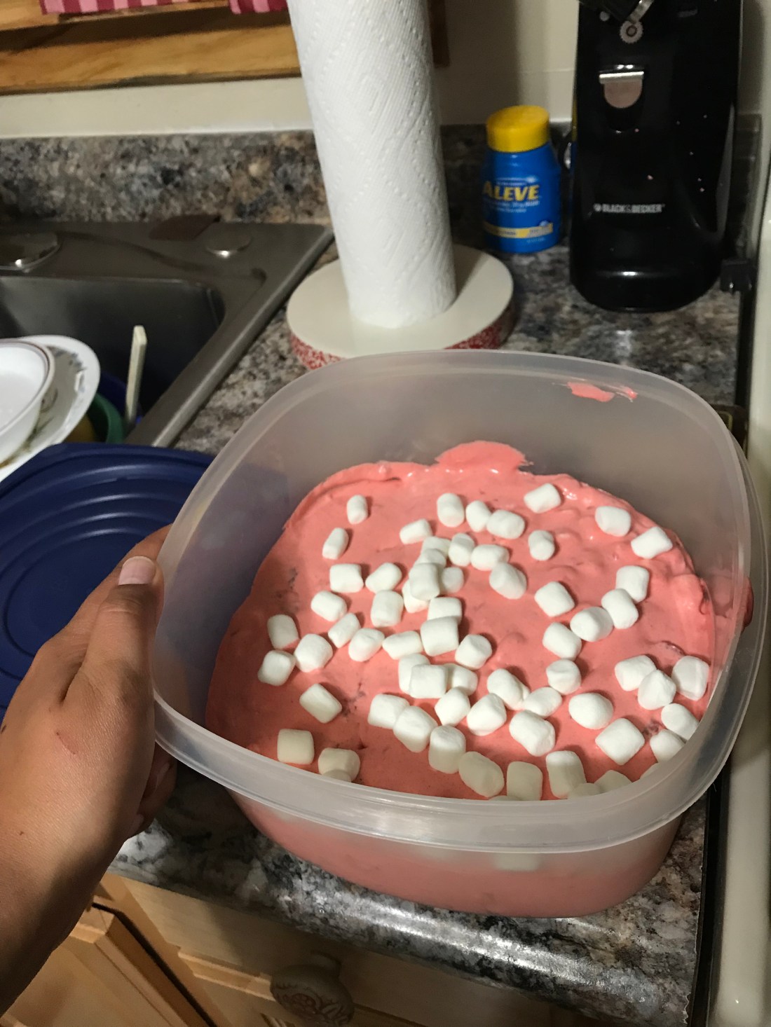 I asked my grandma if there was any deserts i could make that she likes. She already had the ingredients at home and she pulled out the stuff to defrost. You take one package of cream cheese and cool whip then mix it together. You two small packets of strawberry jello and mix it in. Then you add strawberries(we used frozen). Make sure it’s all mixed well. The last thing that was added was marshmallows. You put it in a container and put it in the fridge. This little desert took me about 10 minutes to make. I think it was super cool i wiped up this desert in such a short amount of time. If i’m ever craving a sweet I know I know a quick one I can whip up. π